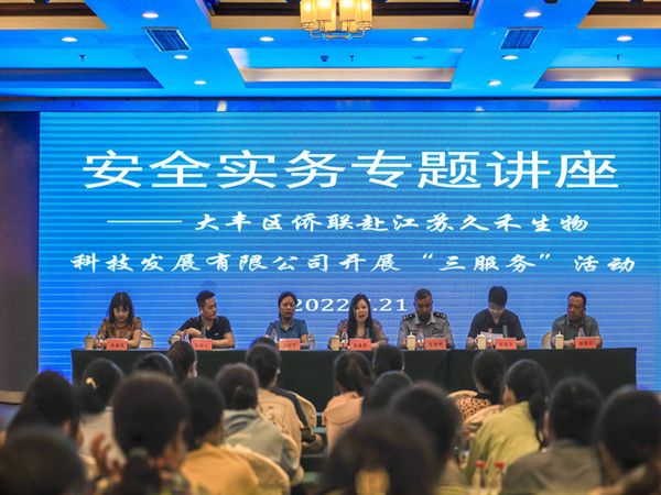 7月21日,盐城市大丰区侨联主席蒋美萍一行赴涉侨企业江苏久禾生物科技发展有限公司开展安全实务专题活动,旨在深入做好“三服务”工作,切实维护侨资企业和群众百姓生命安全。区公安局交通警察大队副大队长宋春明,区人民医院120负责人、急诊医学主任医师、中国红十字会应急救护培训师沈桂芳应邀授课,江苏久禾生物科技发展有限公司副总经理张银文和近200名侨资企业职工一同参加。
